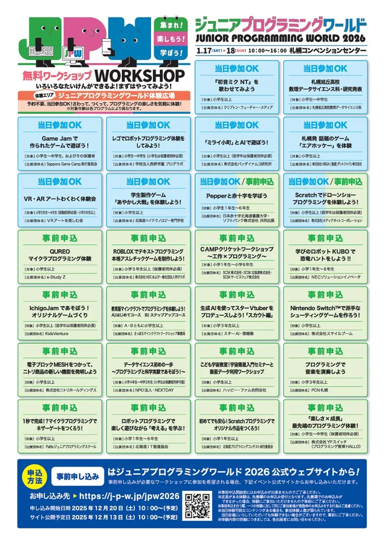 2026年1月17日(土)・18日(日)の2日間、札幌コンベンションセンターにて、国内最大級のプログラミングイベント「ジュニアプログラミングワールド2026」が開催されました 。記念すべき10回目の開催となった今回は、2日間で延べ4,500人(17日:約2,000人、18日:約2,500人)もの方々にご来場いただき、会場は終始活気に満ちあふれていました。