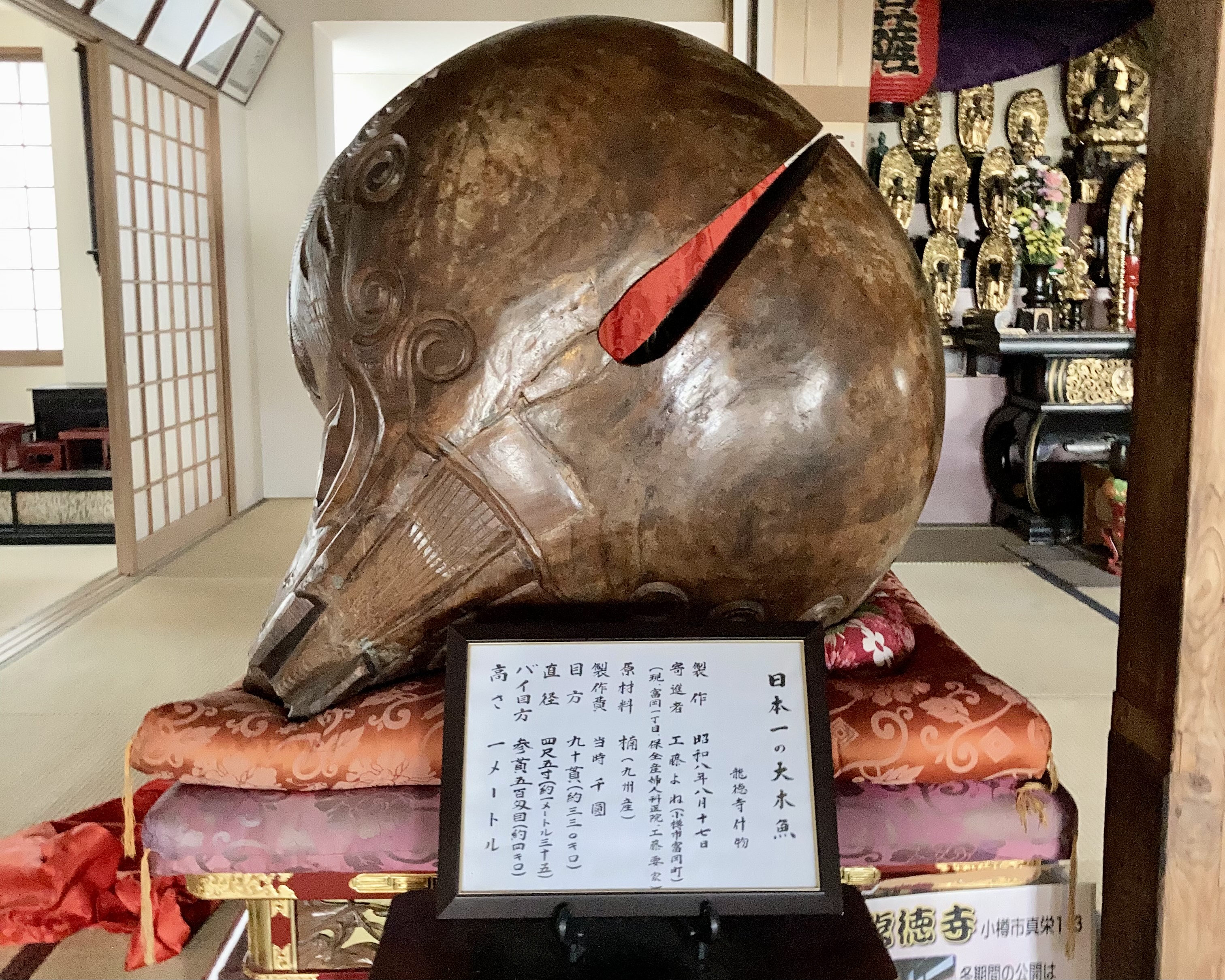 このお寺で有名な「一本彫り」の木魚は、日本一の大きさといわれています。九州産の楠(クスノキ)から出来ていて、直径1.35メートル、高さ1メートル、重さは約330キロと大迫力です。実際に間近で見ると圧倒されます。これはなかなか他の寺院では見る事が出来ないので必見ではないでしょうか。