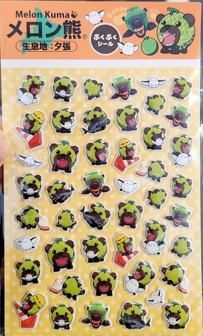 メロン熊は、北海道夕張市の「メロン熊の家」のマスコットキャラクター。頭がメロンになったクマの姿をしている同市の人気キャラクターですが、このぷくぷくシールが販売されています。
