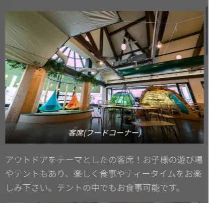アウトドアをテーマとした客席があり、テントの中でも食事が出来ますよ。