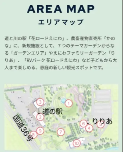 道の駅「花ロードえにわ」をはじめ、子どもが思いっきり遊べる「ファミリーガーデンりりあ」や花の街として有名な恵庭市を象徴するようなガーデンエリアなどから構成される観光スポットです。