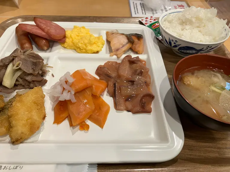 ジンギスカン、ホッケフライ、塩辛、ホッケのつみれ汁、サーモン等、北海道名物満載の朝食です。