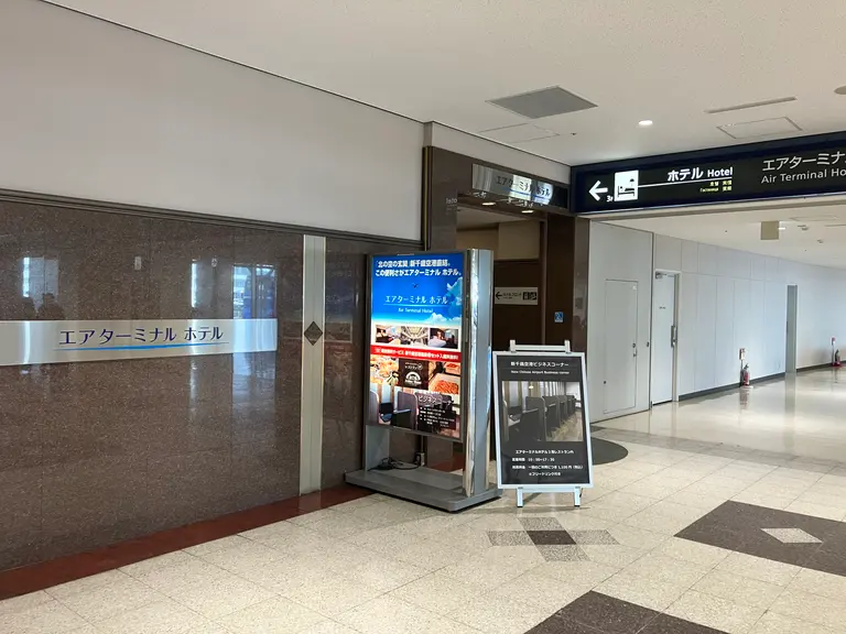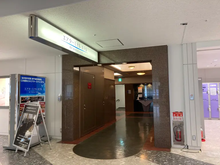 エアターミナルホテルは、ターミナルビル南側(JAL側)にあり、出入口は1F到着ロビーの到着口5番横と2F出発ロビーの出発口E横の2か所があります。