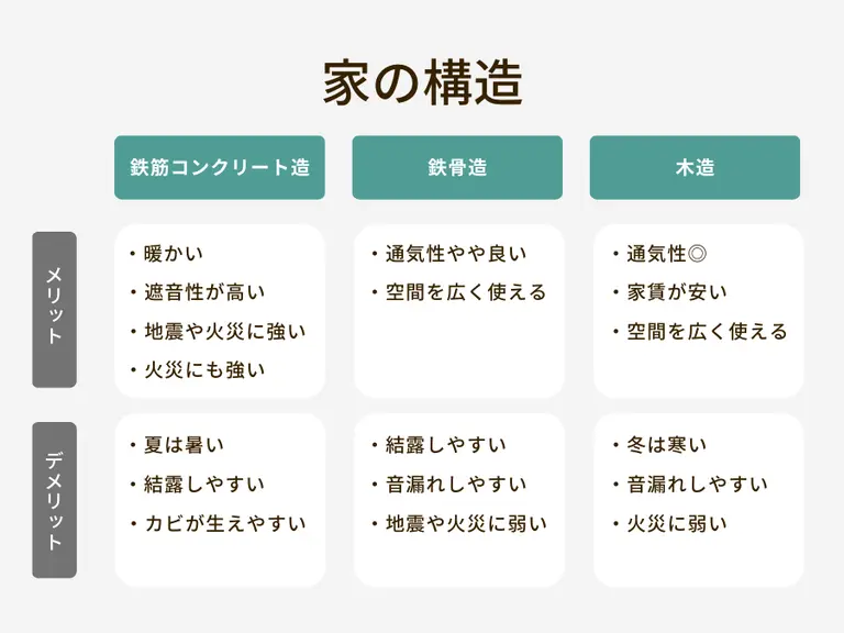 一方、鉄骨造や木造は、テラスハウスタイプなどの低層階の物件に多いです。