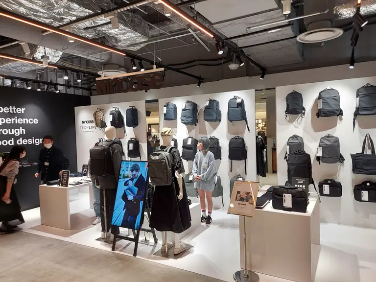 店内の壁一面には、人気のリュックやバッグパック、トートバックが並んでいて、サイズやカラー、背負い心地を試すことができます。ほかにもケーブルや充電器などを収納するケースなども展開されており、ライフスタイルに合った商品を選ぶことができそうです。