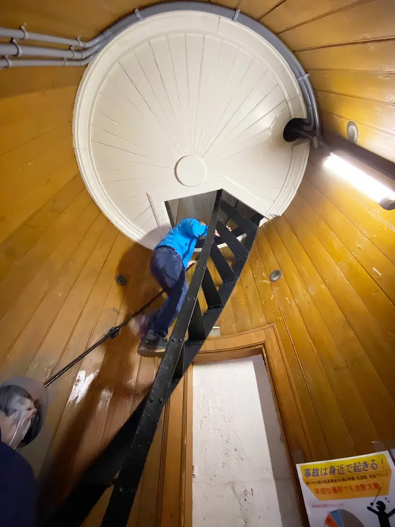 階段で上っていくのですが、階段というよりはほぼ「はしご」。螺旋しながらほぼ垂直に上っていきます。