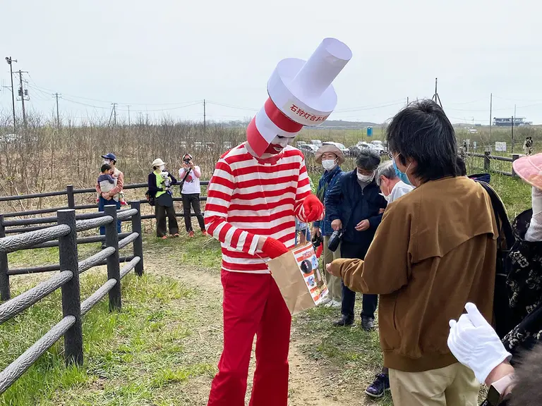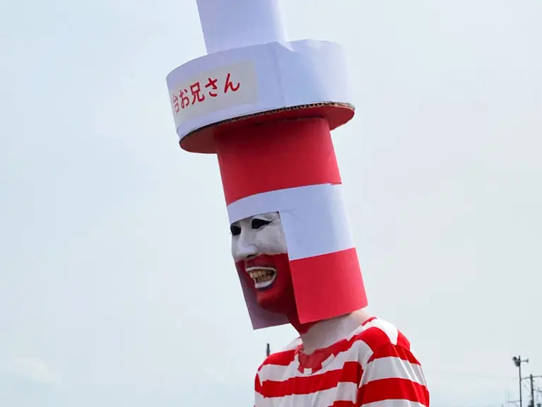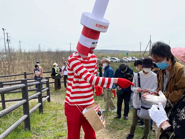 よーく見ると、灯台お兄さんが紙袋から何かを取り出して配っています。飴ちゃん?ポケットティッシュ?何配ってんだろ??