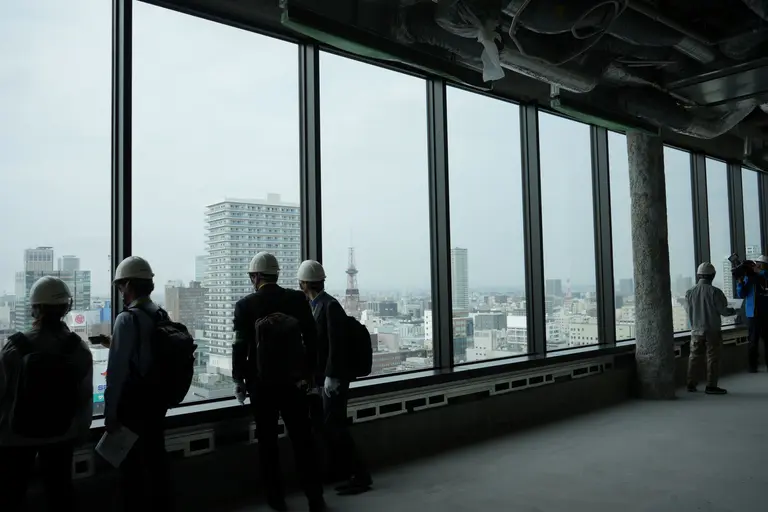 続いて18階の大浴場へ。上の写真は脱衣場ですが広々として快適そう。浴場は工事中につき見学できませんでしたが、ここも眼下に札幌を一望する絶景が楽しめそうです。スタイリッシュでラグジュアリーな空間になること間違いなし。今からオープンが楽しみです。