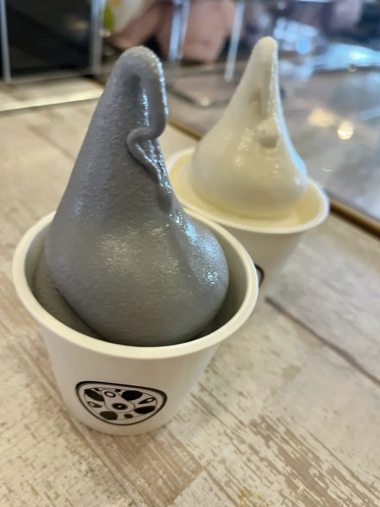 テイクアウトコーナーのもくもくD51ソフトは、煙を出しながら力強く走る蒸気機関車をイメージした灰色が特徴的。ごま味に見えますが、実は濃厚バニラ味!