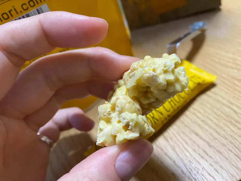 とうもろこしのパフをホワイトチョコレートでコーティング、ザクザクとした食感ととうもろこしの風味もしっかり感じられてとっても美味しいです。