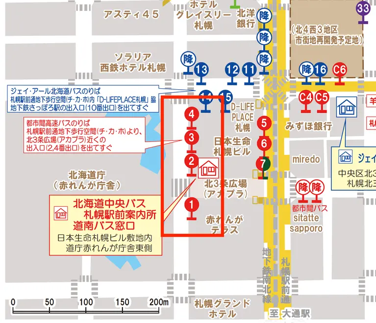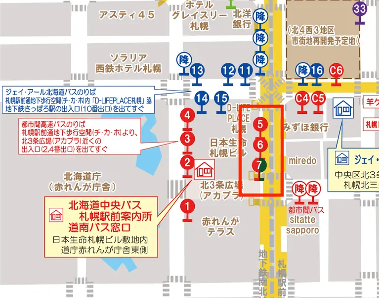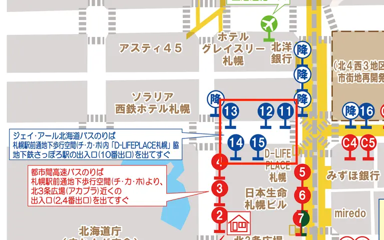 ・1~7のりば:地下鉄南北線さっぽろ駅の10番出口、チカホの2番出口、4番出口(チカホ北3西4にエレベーターあり※)