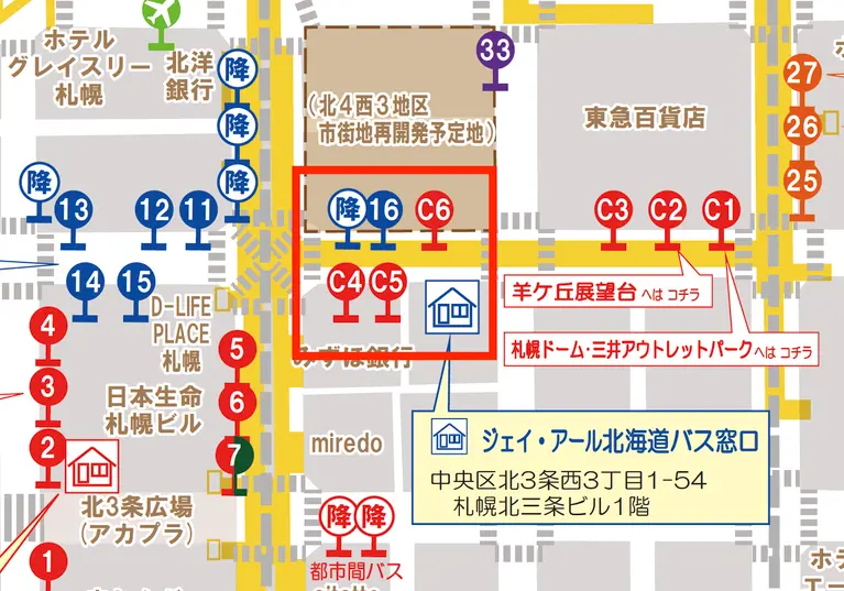 ジェイ・アール北海道バスの降車場が北4条西3丁目(北4西3地区市街地再開発予定地南側)に1箇所、駅前通(北洋銀行札幌駅南口支店前)側に3箇所、西5丁目通側に1箇所あるが、自分の乗るバスはどちらなのか。