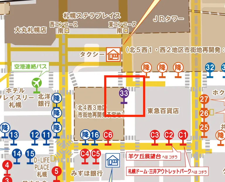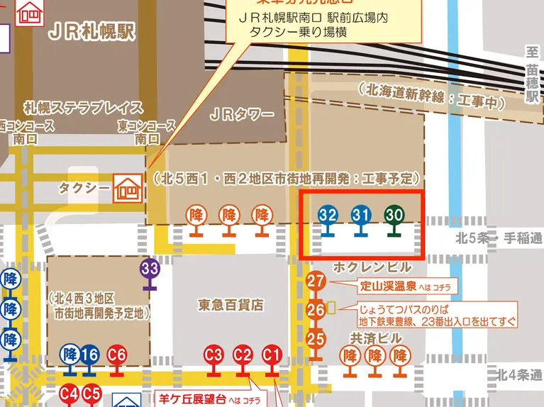 ・30~32のりば:地下鉄東豊線さっぽろ駅の18番出口(23番出口にエレベーターあり)