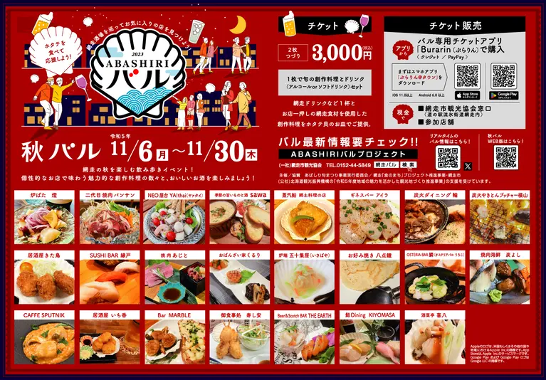 網走の秋の一大イベント「網走バル」が、いよいよ11月6日から11月30日までの約1か月間、居酒屋、焼肉屋、お好み焼き屋、バーなど、様々なジャンルの飲食店23店が参加して開催されます。