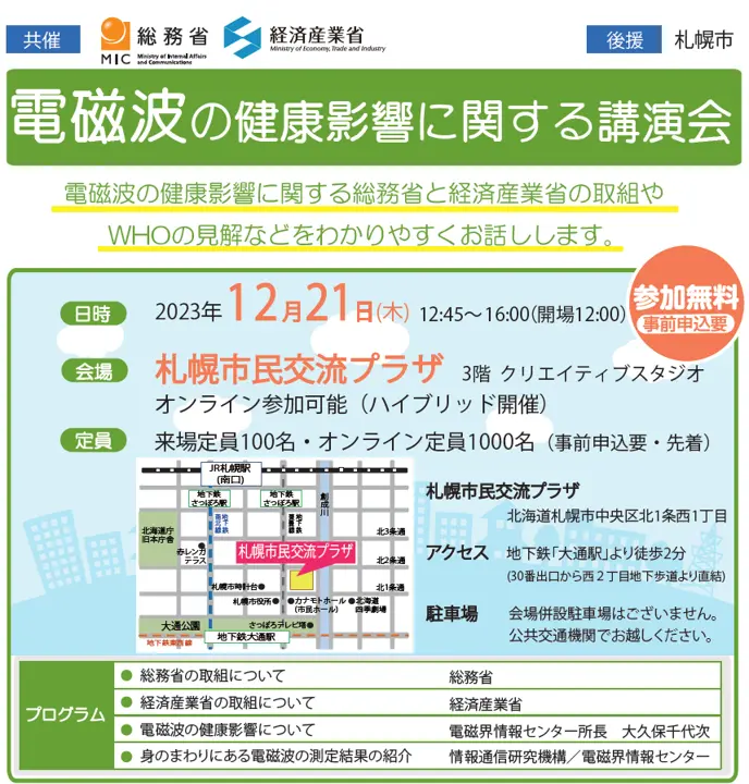 そこで総務省と経済産業省は12月21日(木)12:45 ~ 16:00、市民交流プラザにて「電磁波の健康影響に関する講演会」を共同開催。