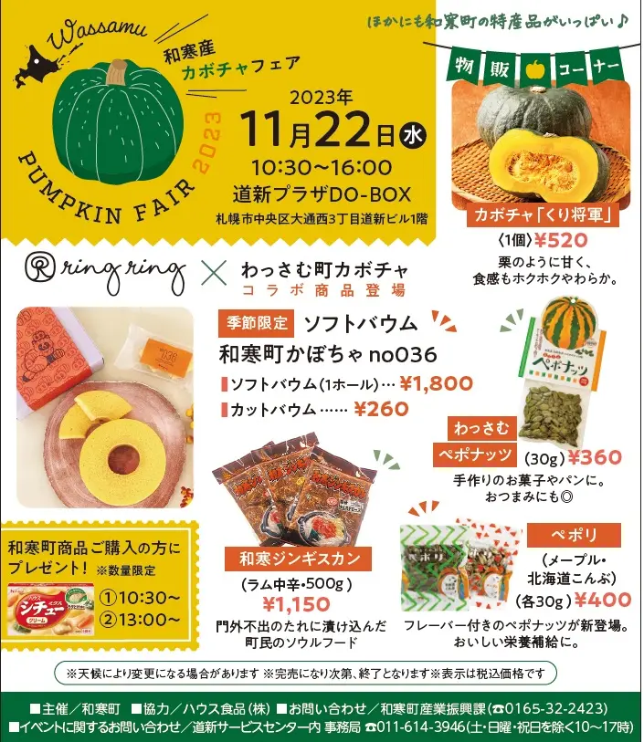 北海道新聞1階<道新プラザDO-BOX>で毎年開催される『和寒産カボチャフェア』が今年も11月22日(水)に開催されます!