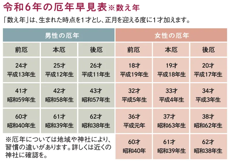 厄年の年齢は体調や社会的立場に変化が起こりやすい時期ゆえ、気を引き締め、健康に注意して過ごそうという意味があります。