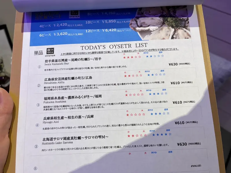 1番上のものから順番に下にいくにつれて味が濃厚になっていくそうです。もちろん牡蠣は単品でも注文することができますよ。