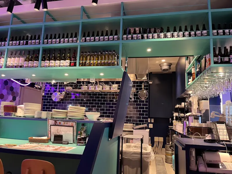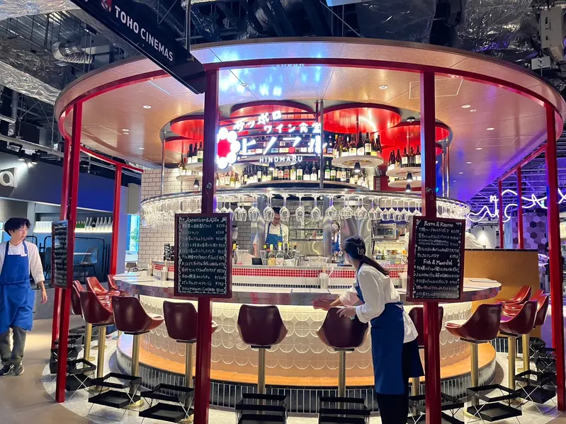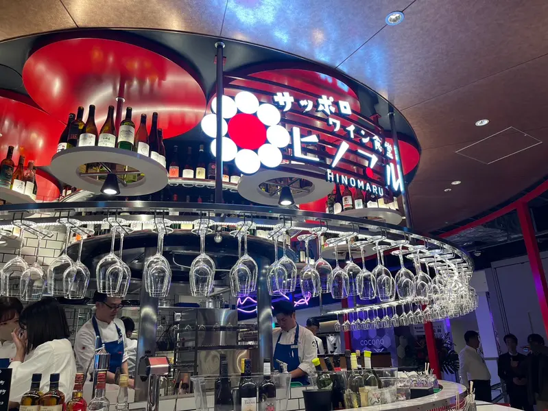 エスカレーターを降りるとすぐに現れる、ずらりと並ぶワイングラスとまるい形のカウンターが目を引くバルスタイルのお店です。