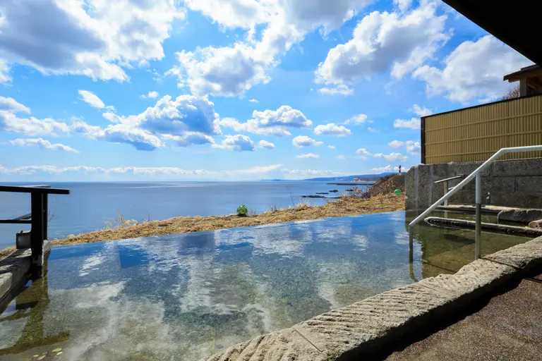 湯船と海がほんとつながっている感じでインフィニティ感があり、海特有の穏やかな波の音、たまに飛んでくるカモメ、遠くにいくにつれ段々と色が変わっていき、奥の方には濃い青色の海が広がっており、美しい光景を楽しむことができます。
