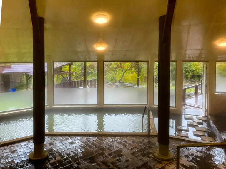温泉街に面した「夢元 さぎり湯」は、大人450円で、硫黄泉と明礬泉(みょうばんせん)の2種類の湯が楽しめる温泉銭湯。加水、加温することなく自然湧出した源泉を浴槽にかけ流していて、営業時間は朝7時から21時まで営業しているので、温泉街に宿泊したついでに入浴するのもおすすめ。有料・無料休憩室があるのでのんびりくつろげることもできます。