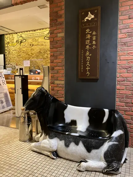 グルメワールドを抜けて、スマイルロード方面へ行く途中のスイーツゾーン「北海道牛乳カステラ」で牛ベンチ発見!