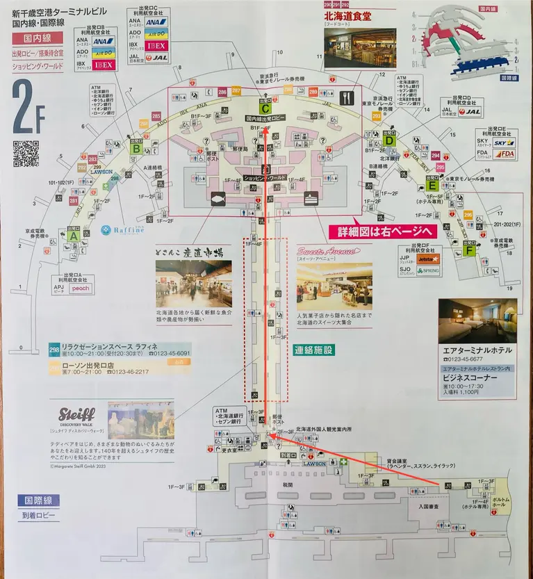 これから紹介する【新千歳空港ターミナルビル国内線2階からスタートして 国際線まで行って戻ってくるルート】は、ただの暇つぶしのお散歩ですが、敢えて探検と呼びましょう!