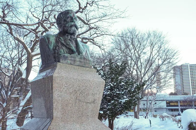 台座には「Boys,Be Ambitious(少年よ、大志を抱け)」の文字が彫られており、今も大学を見守っています。