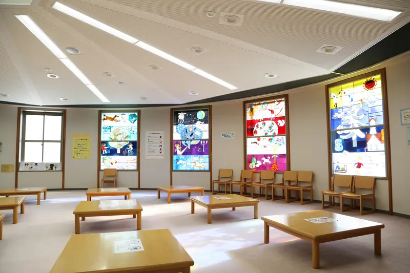 子どもに自由に読み聞かせができる「童話の部屋」は、ステンドグラスから優しい光が差し込む開放的な空間です。