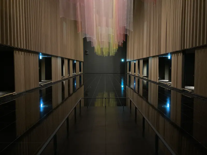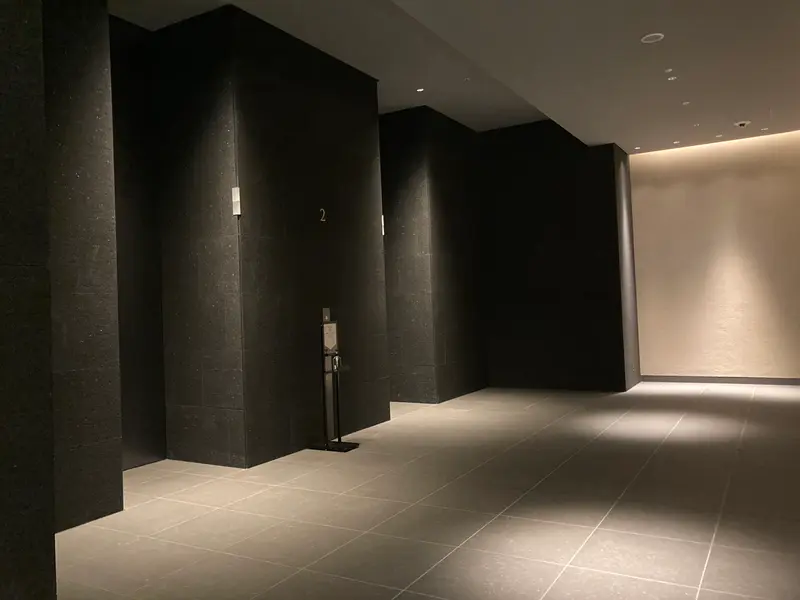 ホテル入口の大きな扉を入ると、調光が変わり 間接照明の灯りで一気に高級感溢れる雰囲気が広がります。静寂の始まりです。