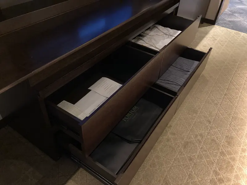 50インチテレビの下に引き出しがあり、室内着・袋・折りたたみミラーなど。