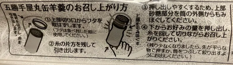 筒にくっついている糸を羊かんに回して切りながら食べます!
