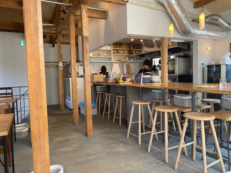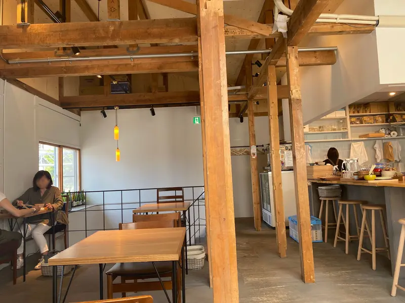 店舗2階が食堂スペースになっています。オーガニックが似合うミニマルデザインの空間。