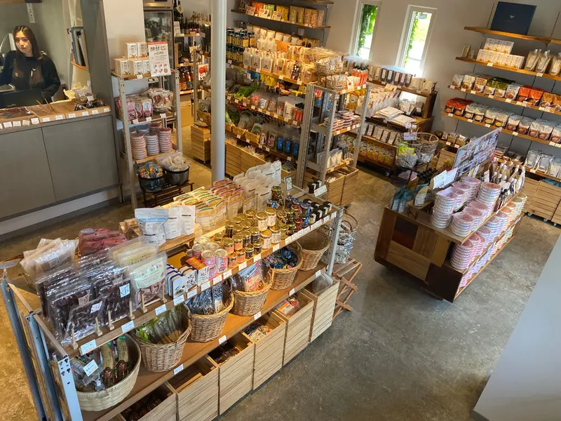 店舗一階では、YUWAERUオリジナル商品をはじめ、全国各地の選りすぐりの無添加食品、調味料やごはんのおとも、お茶などが販売されています。また毎日日替わりのテイクアウトおむすび/おはぎなど販売しています。