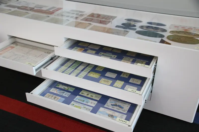 かつての路線図や色鮮やかな記念乗車券の複製など、約150点を展示。引き出しの中の展示は低い位置にあり、小さなお子さんでも近くで見られます。