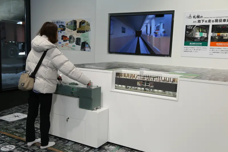 実際に使われていた運転ハンドルを操作して、大通駅をイメージした立体模型の中の小さな車両を走らせることができます。駅のホームに上手に停車できるかな?