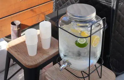 サウナだけではなく「ととのい」の準備も万端です。水風呂、ととのい椅子、レモン水、眼前に広がる札幌の風景。まだ入る前なのに心がととのってきた気がします。