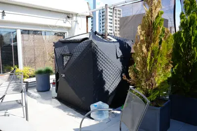 「IESAUNA」のコンセプトは「ベランダで使えるサウナ」で、1畳程度の広さながら狭さは感じません。むしろストーブもストーンもロウリュも独り占めできる贅沢なつくりです。