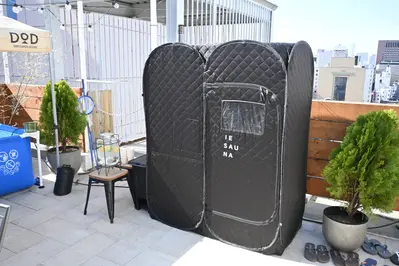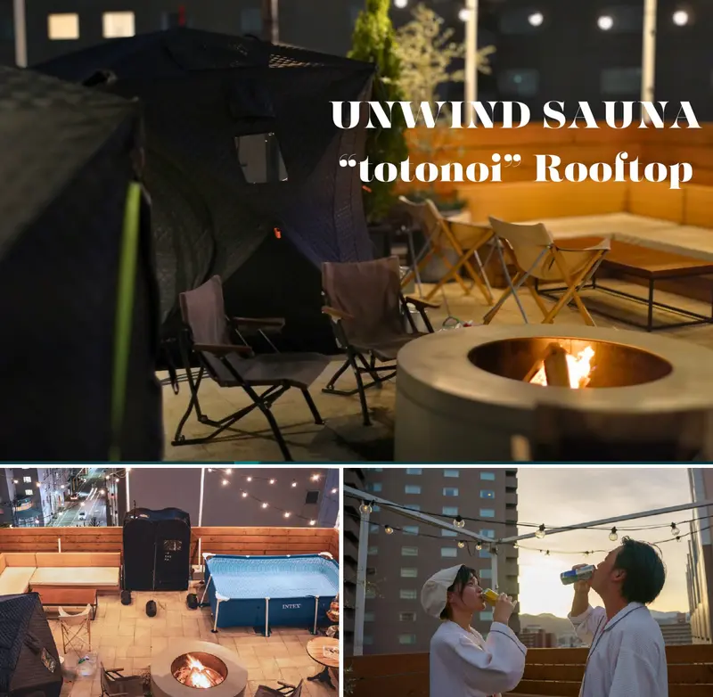 「UNWIND SAUNA "totonoi"Rooftop」と題し行われたのは、ポータブルテントサウナのブランドIESAUNA(千葉)とのコラボイベント。非日常感とサウナを融合したコンセプトで、昨年11月以来の開催だそうです。