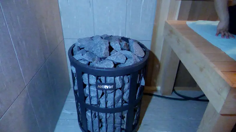 ストーブはHARVIAで、もちろんセルフロウリュできます!HARVIAの特徴として、側面が網目になっているので、石の隙間へ水を注ぎ込むと、ストーブ横からも蒸気が出て、より温かい蒸気を感じることができます。(サウナーの豆知識)
