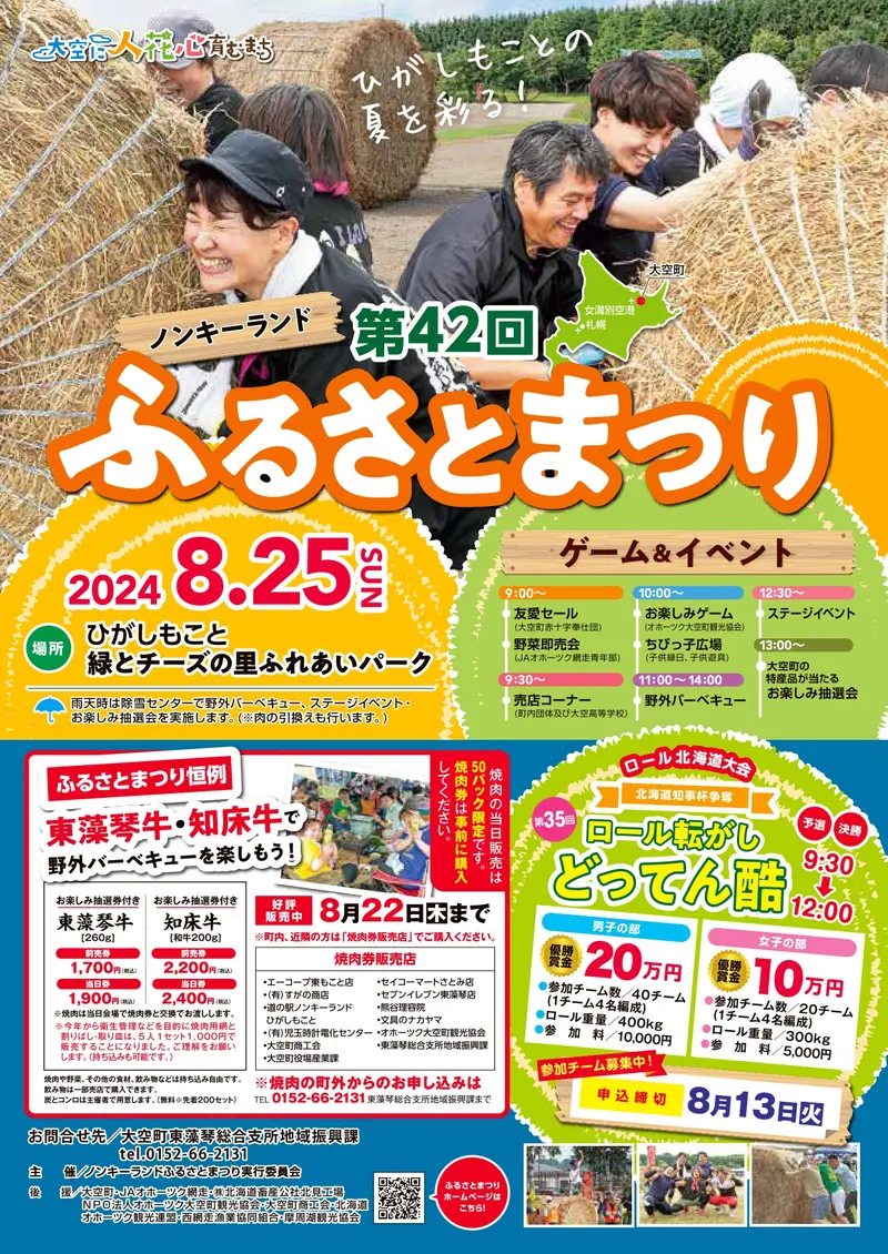恒例の東藻琴牛・知床牛が野外バーベキューで楽しめるほか、野菜の即売会、子ども縁日、お楽しみ抽選会、ステージイベントなどもあります。そして、メインイベントは、賞金20万円(男子の部 女子の部は10万円)をかけて、4人1チームが重さ400kg(女子は300㎏)の牧草ロールを転がし、ゴールまでのタイムを競う「ロール転がしどってん酷」。応援している方も思わず力の入る白熱のレースが展開される、東藻琴ならではのイベントです。