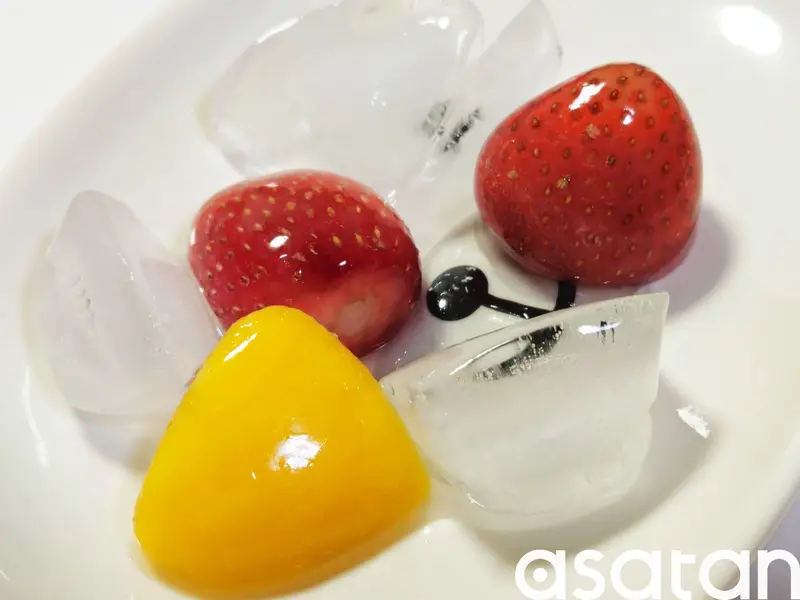 韓国発のスイーツで、フルーツを氷に閉じ込めたもので、主に使用するフルーツはイチゴ、ブドウ、ミカン、パイナップルなど。
