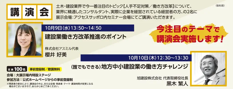 土木・建設業界で今一番注目のトピック【人手不足対策/働き方改革】について、実際に企業を経営されている経営者・黒木繁人氏に講演いただきます。