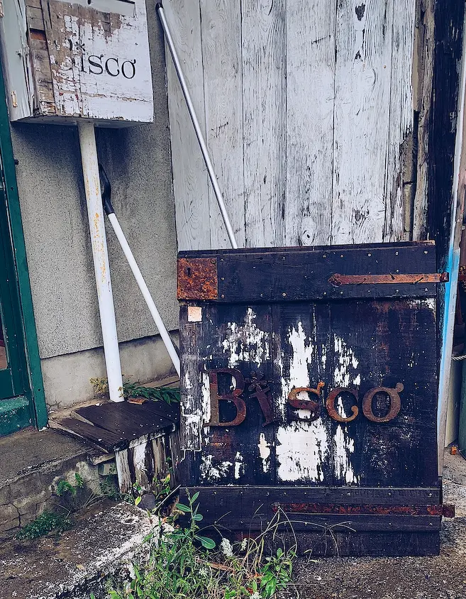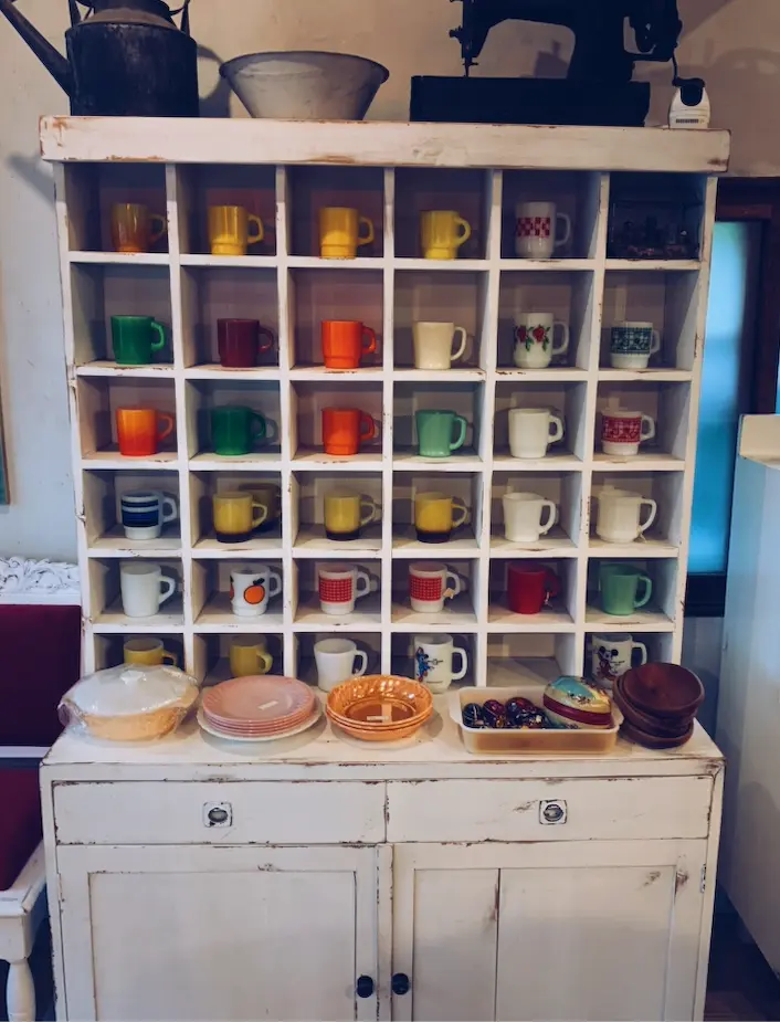Biscoは東区にあるアンティークとヴィンテージ家具のお店。アンティークやビンテージの家具を探している方はぜひ一度訪れてみてください。お店の看板がすでに良い味を出しています。店内に入るとまずは雑貨類が並んでいます。どれも可愛い雑貨ですが、棚に並べているカラフルなファイヤーキングのカップがなんともキュート!