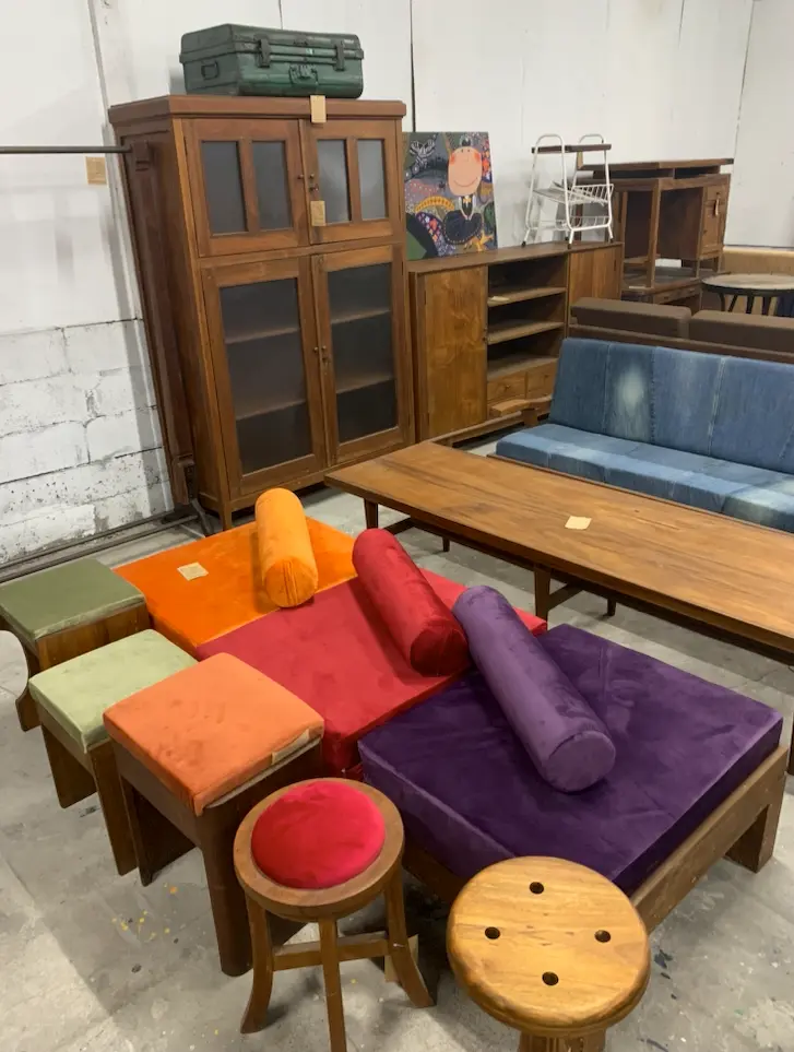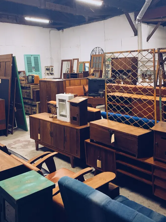 可愛い雑貨スペースを通り抜けると、倉庫のような広い店舗が出現!所狭しと椅子やテーブルなどの家具が並んでいます。全てアンティーク&ビンテージ家具ですが、どれも良質な材料で作れたしっかりとした作りの家具でばかりで、さらにメンテナンスも行き届いている印象なので安心して購入できます。