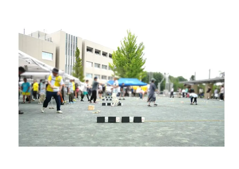 モルックを投げ、数字が書かれたスキットルを倒して点数を競うスポーツです。