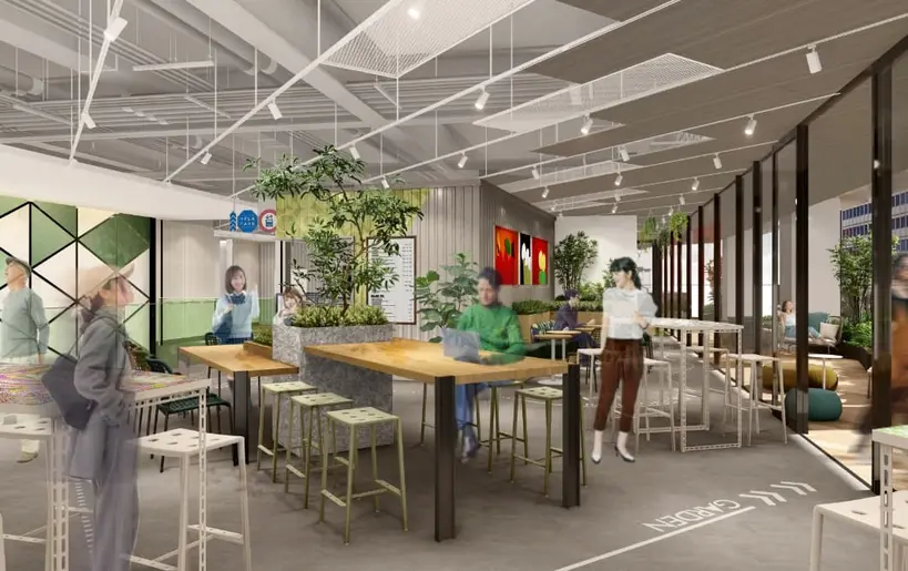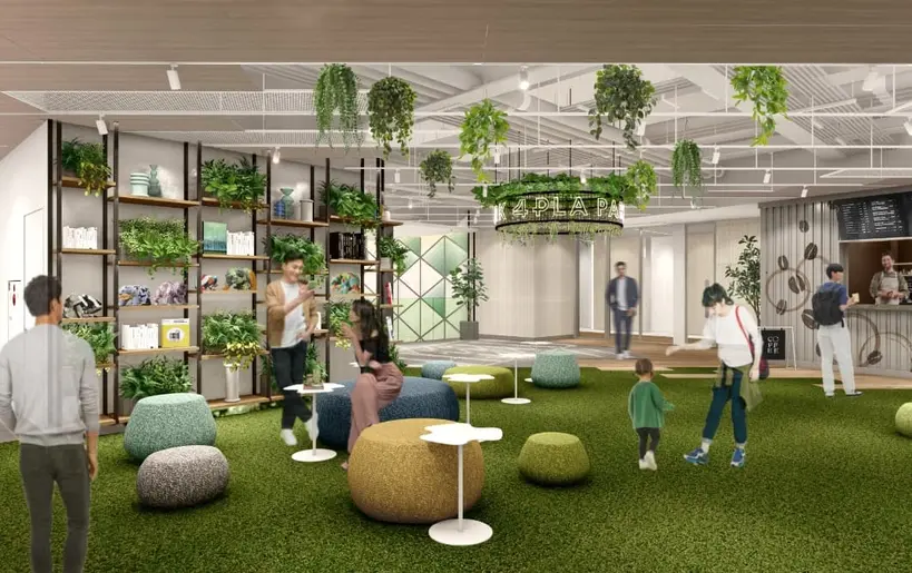 2階と3階は、明るく開放的な空間デザインで、物販や飲食店舗が出店する予定とのこと。3階のまちのリビング「4PLA PARK」では、や天井の壁面の緑や、床一面に広がった芝、アート作品などに囲まれ、季節に関係なくいつでも公園のように楽しめる空間になるほか、外周部には屋外テラスもできるようなので、4丁目の十字街、交差点エリアのランドマークとして人気を呼びそうです。