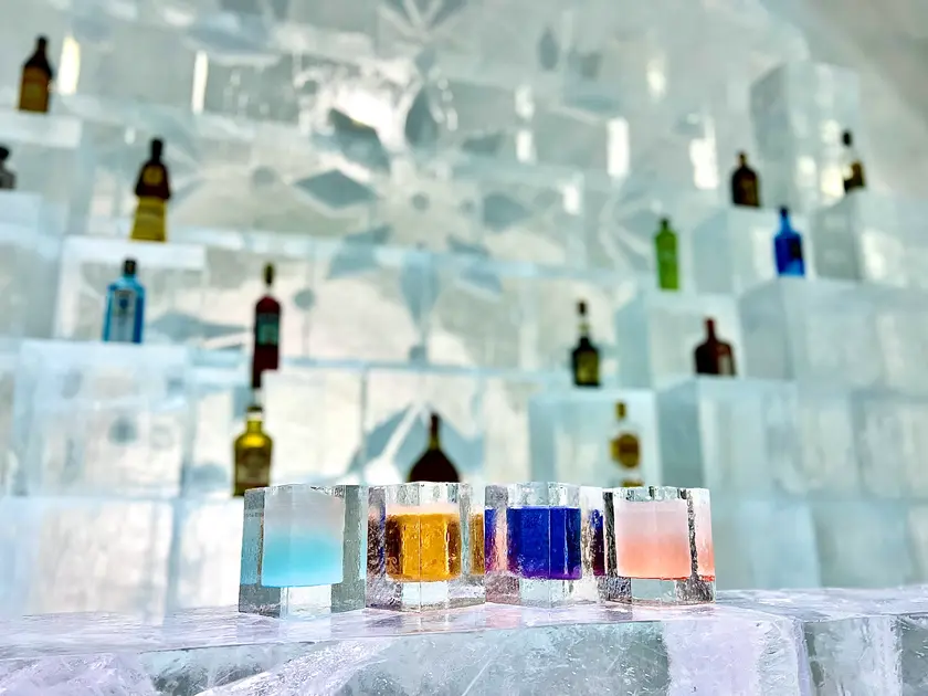 バーカウンターも、グラスもぜんぶ氷!北海道の地酒やホットカクテルが楽しめる。