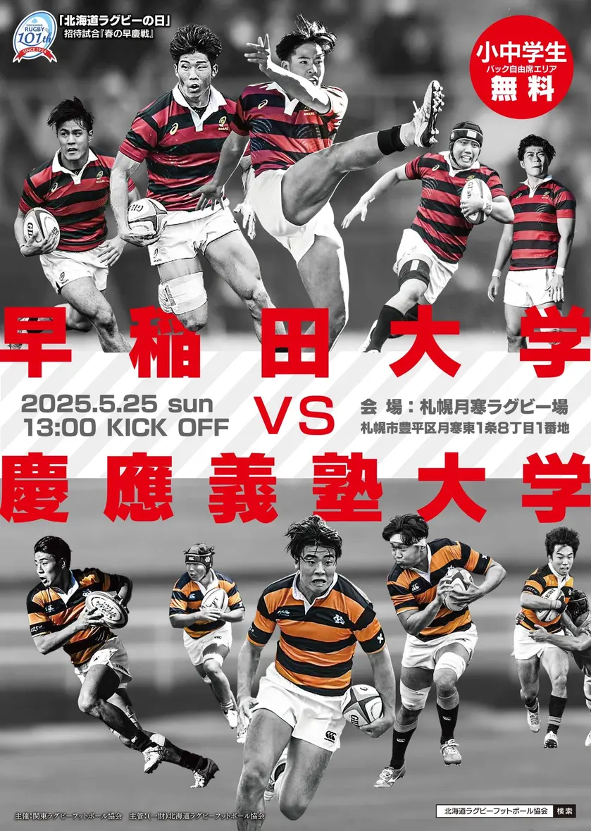 5⽉25⽇(日)札幌月寒ラグビー場でインフォマートプレゼンツ「北海道ラグビーの日」2025招待試合として、伝統と格式ある関東大学ラグビー対抗戦の“早慶戦”(早稲田大学vs慶應義塾大学)が行われます。