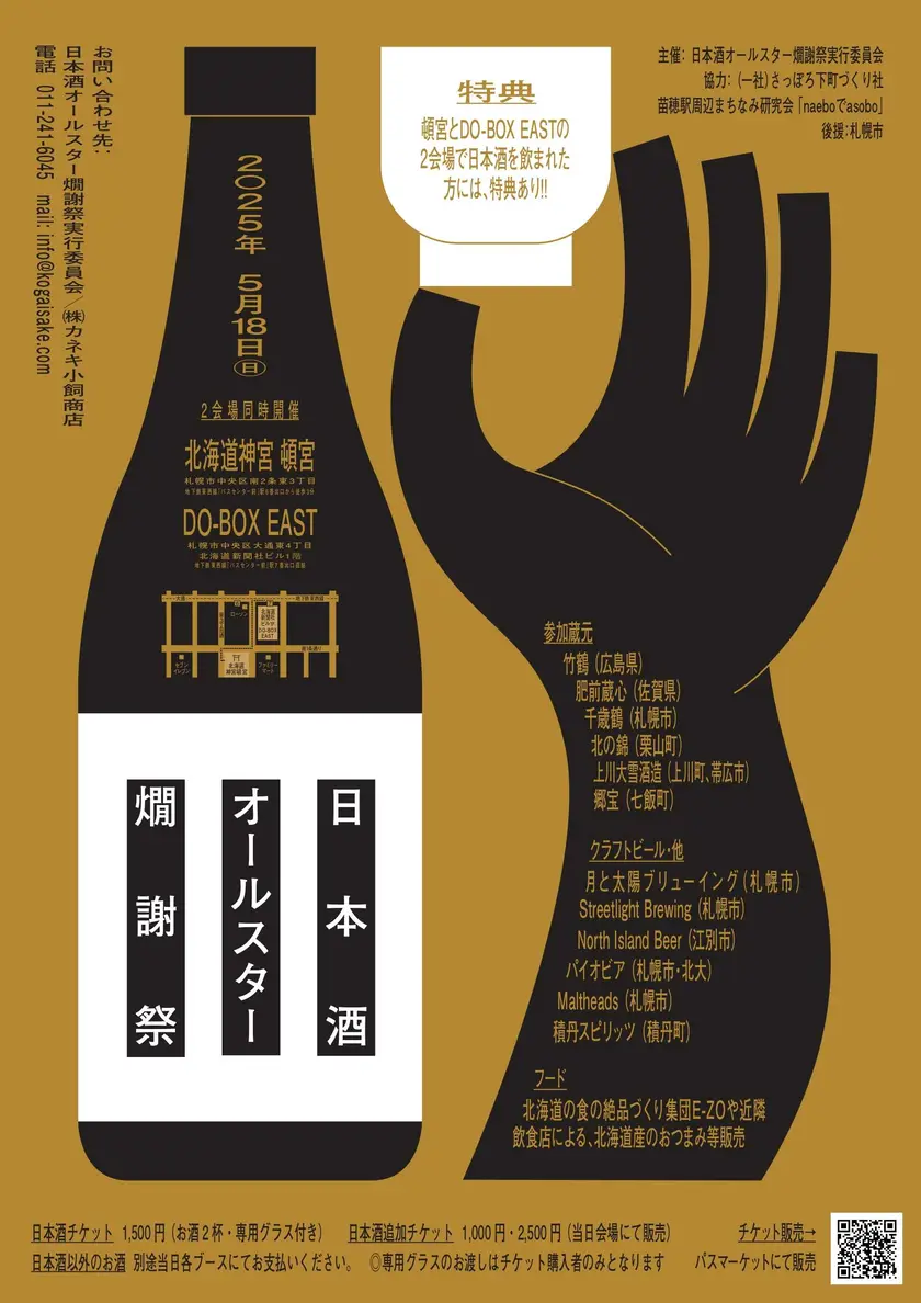 “神社で飲む日本酒”をテーマに、北海道神宮頓宮を舞台に2017年・2019年・2024年と開催した「日本酒オールスター燗謝祭」。4回目を迎える2025年は、北海道神宮頓宮のほかに、近隣の北海道新聞社イベントスペース「DO-BOX EAST」も会場となり、パワーアップしての開催になります。今回は北海道内外の日本酒、クラフトビール、ジンもご用意。北海道絶品づくり集団「E-ZO」や近隣飲食店によるフードブースも。頓宮と「DO-BOX EAST」の2か所で日本酒を飲まれた方にはお得な特典も用意されています。